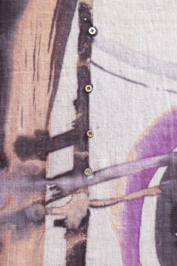 Mono print on cotton fabric, nails, broken wood frame, wood board, non-slip mat